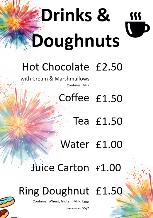 - JLPS Drinks & Doughnut Stall – Hot Chocolate with Cream & Marshmallows, Tea, Coffee, Water, Juice Cartons & Ring Doughnuts.